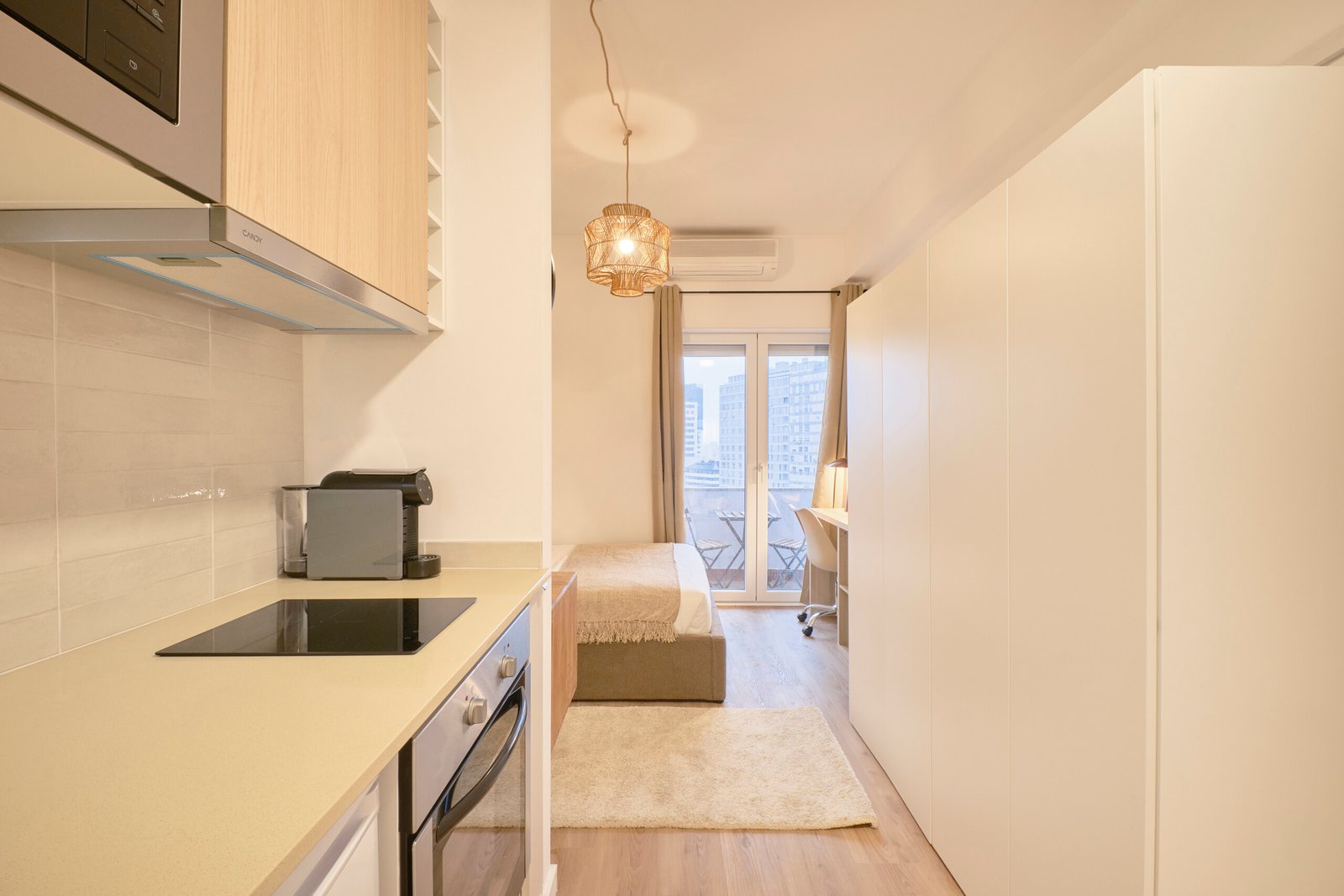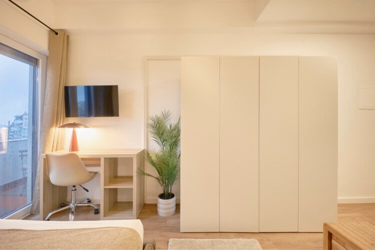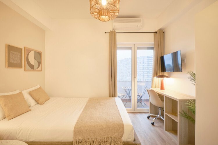 Beautiful studio with private kitchen and bathroom in Campolide. The flat is on the 5th floor and has elevator. It`s a 9- room apartment with 9 full bathrooms, only 2 rooms share 2 bathrooms, all others belong to the other rooms. It is located 5min walking distance from Amoreiras, 10min from Marquês de Pombal metro station (blue and yellow line) and also 10min from São Sebastião metro station (red and blue line). The bills (water, electricity, gas and wifi) are included in the price as well as weekly cleaning of all common areas twice a week.