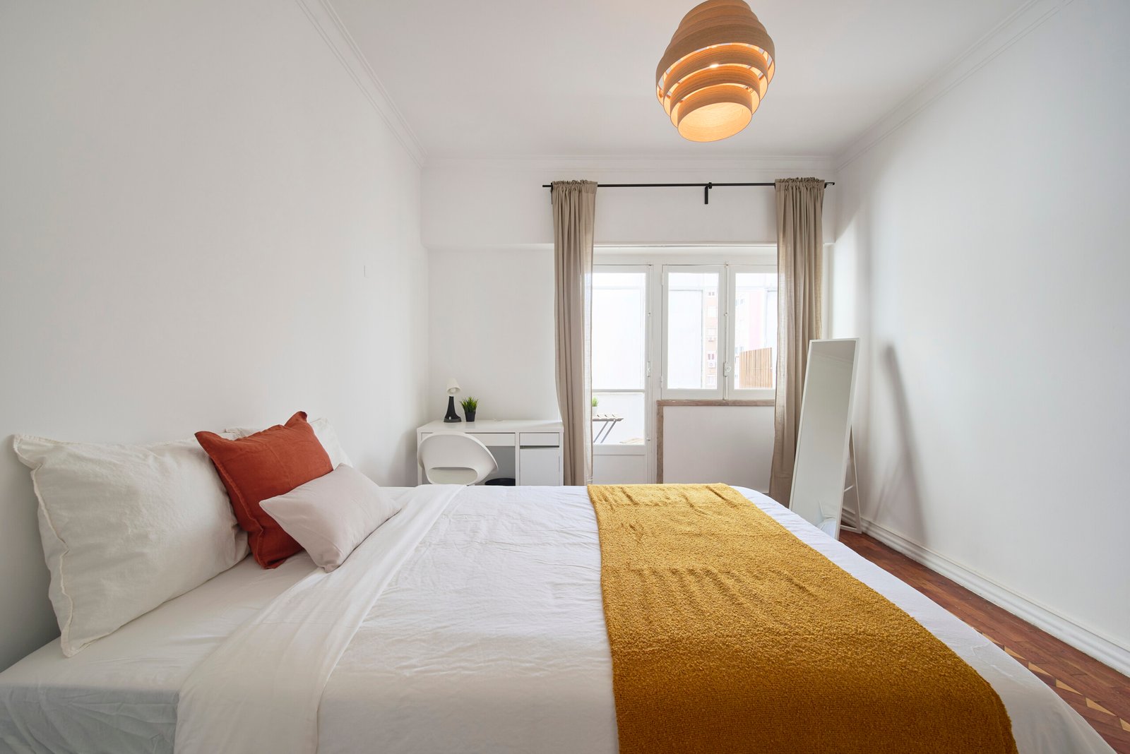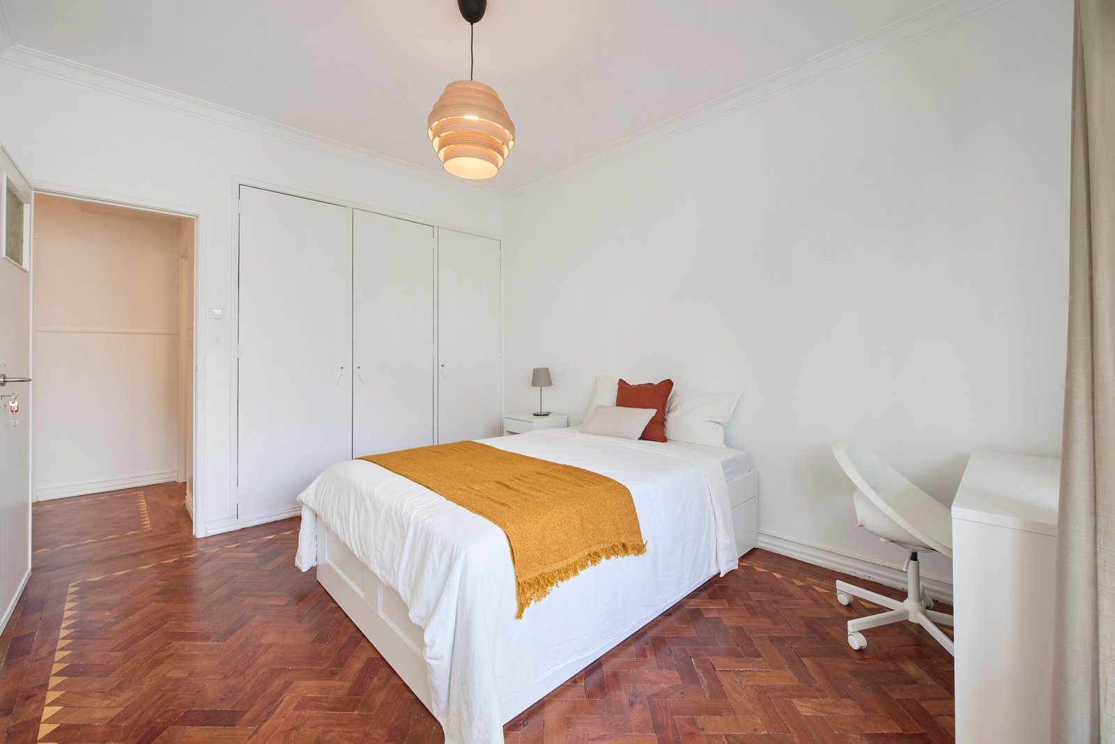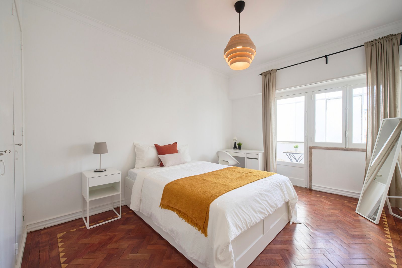 Beautiful double room in Campo Pequeno with balcony. The flat is on the 2nd floor and has elevator. It`s an 8- room apartment with 2 full bathrooms and an extra bathroom that belongs to an ensuite. It is located 1min walking to Campo Pequeno metro station (yellow line). The bills (water, electricity, gas and wifi) are included in the price as well as weekly cleaning of all common areas twice a week.