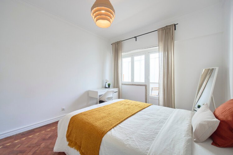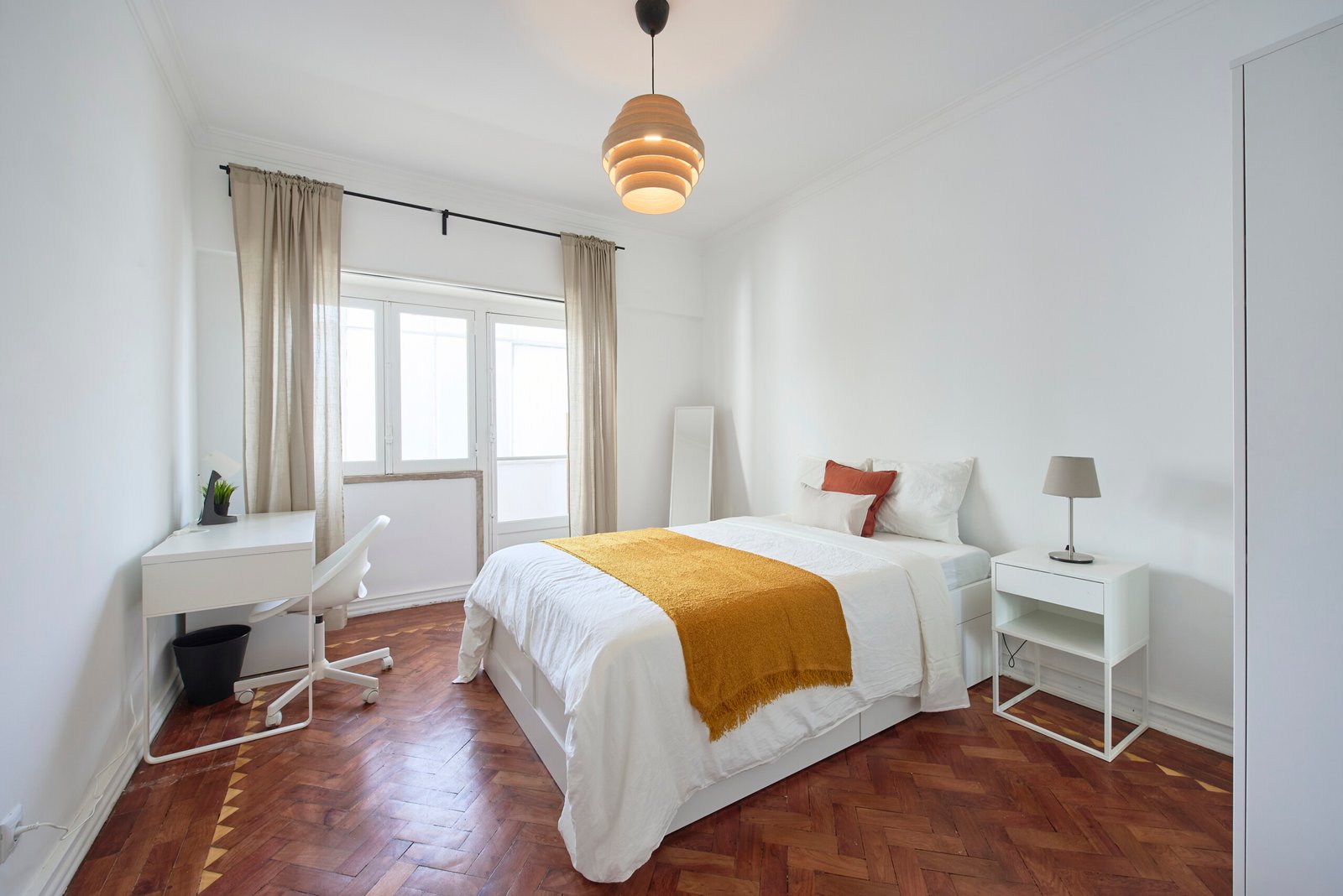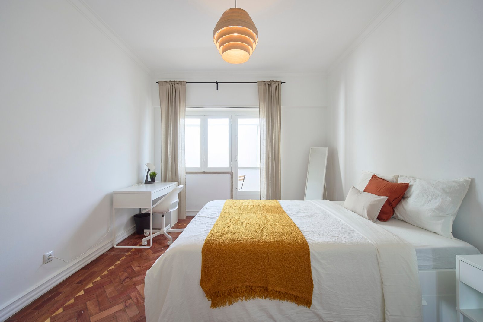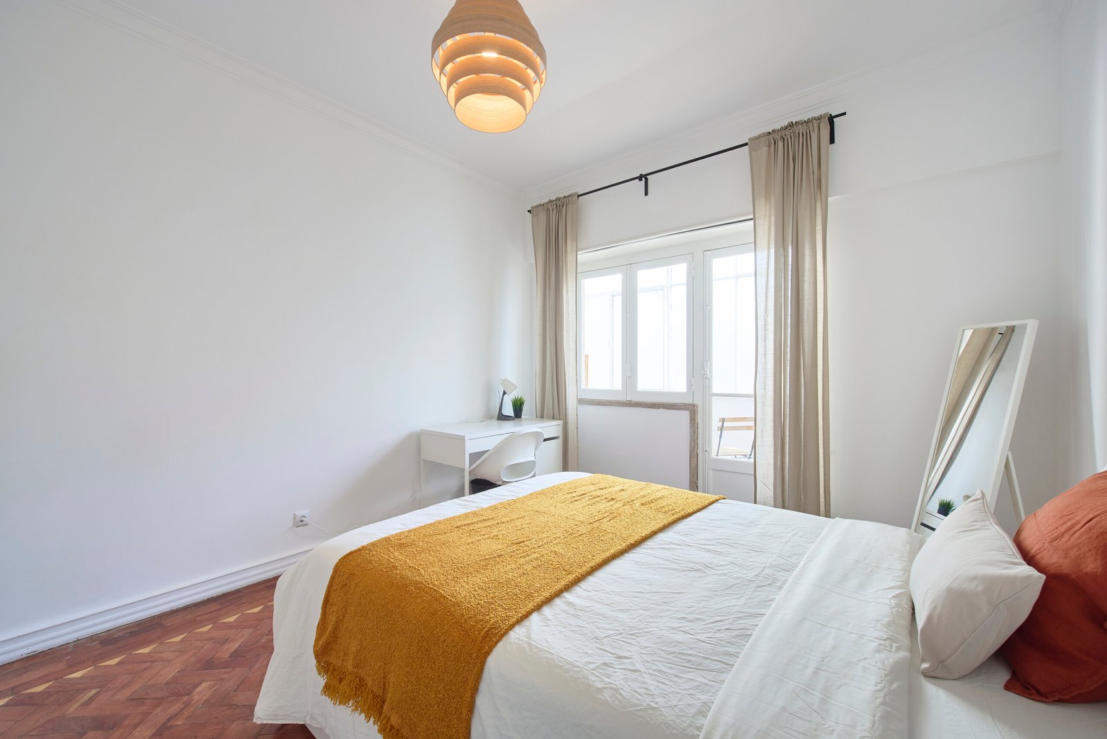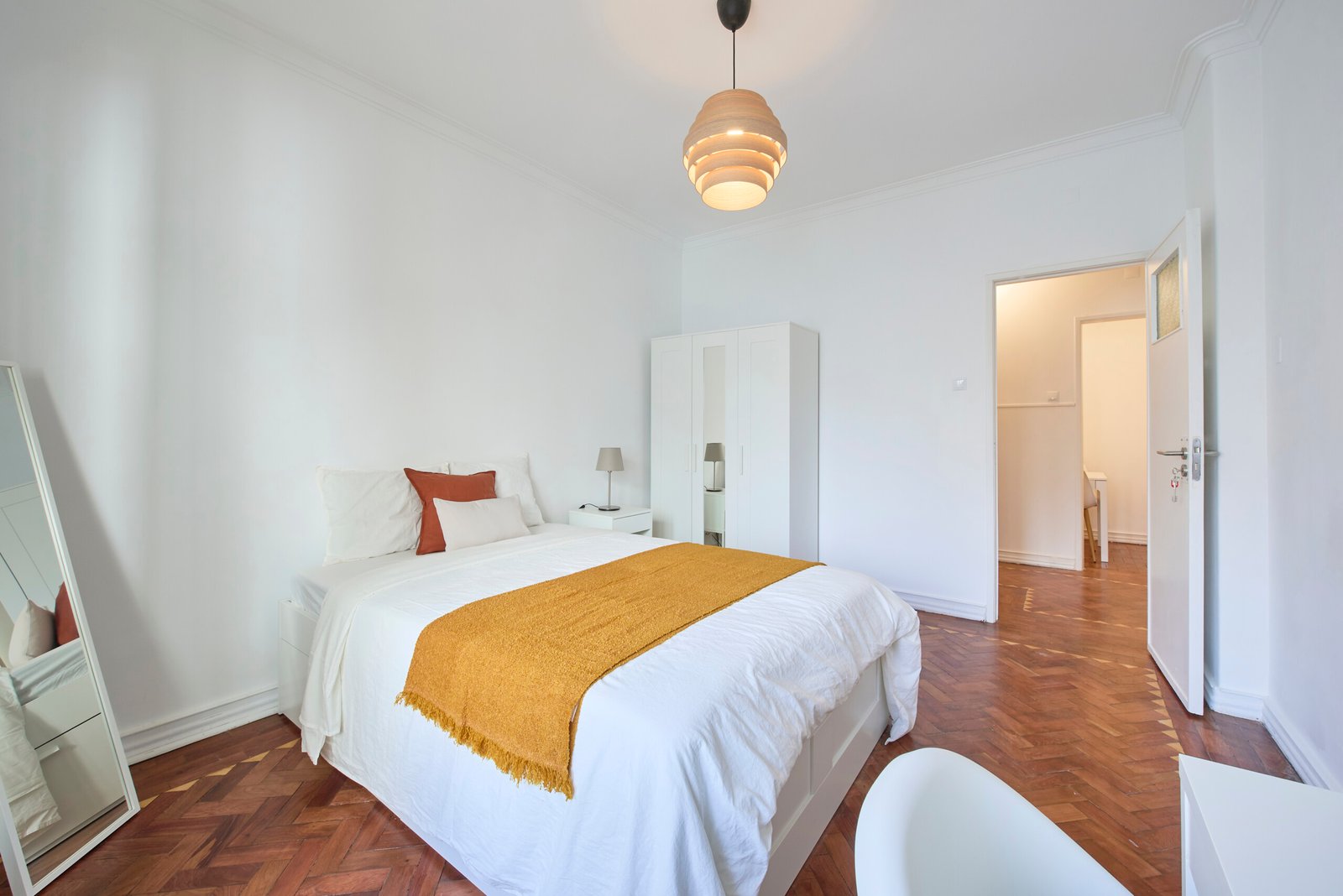 Beautiful double room in Campo Pequeno with balcony. The flat is on the 2nd floor and has elevator. It`s an 8- room apartment with 2 full bathrooms and an extra bathroom that belongs to an ensuite. It is located 1min walking to Campo Pequeno metro station (yellow line). The bills (water, electricity, gas and wifi) are included in the price as well as weekly cleaning of all common areas twice a week.