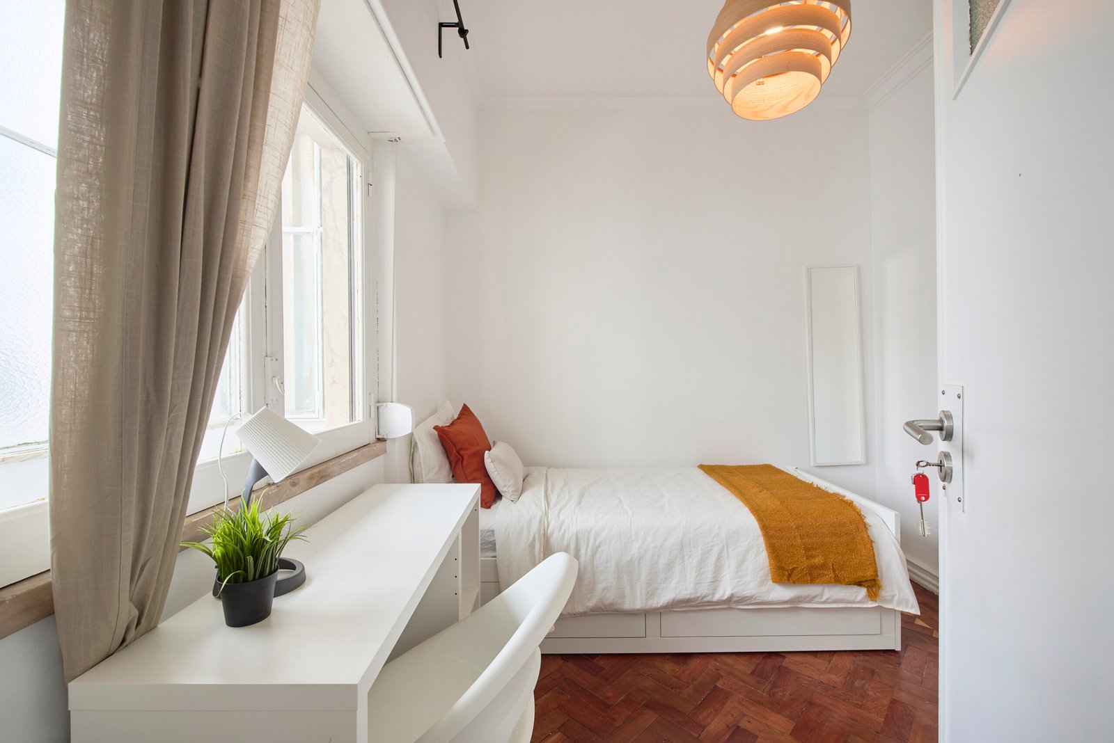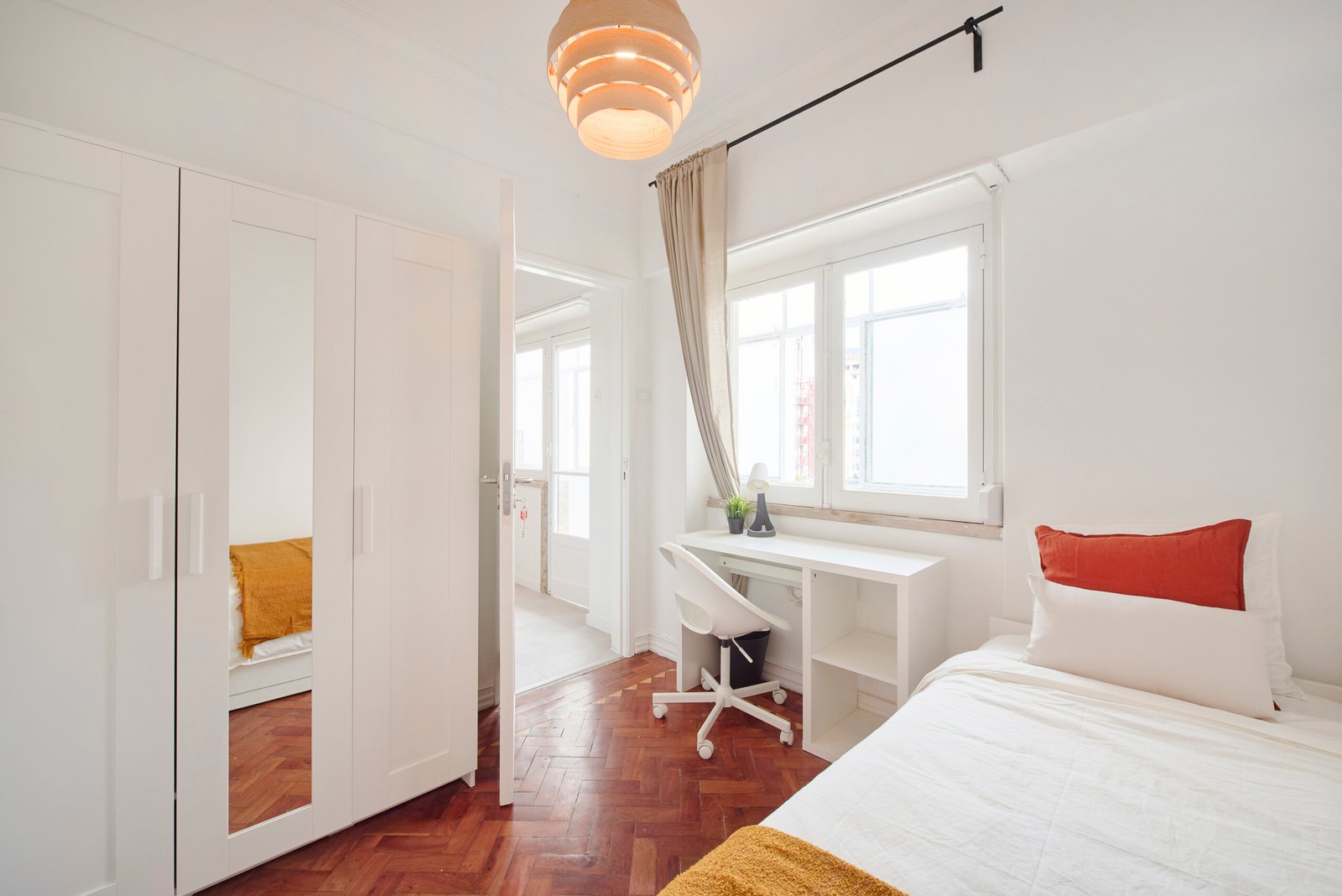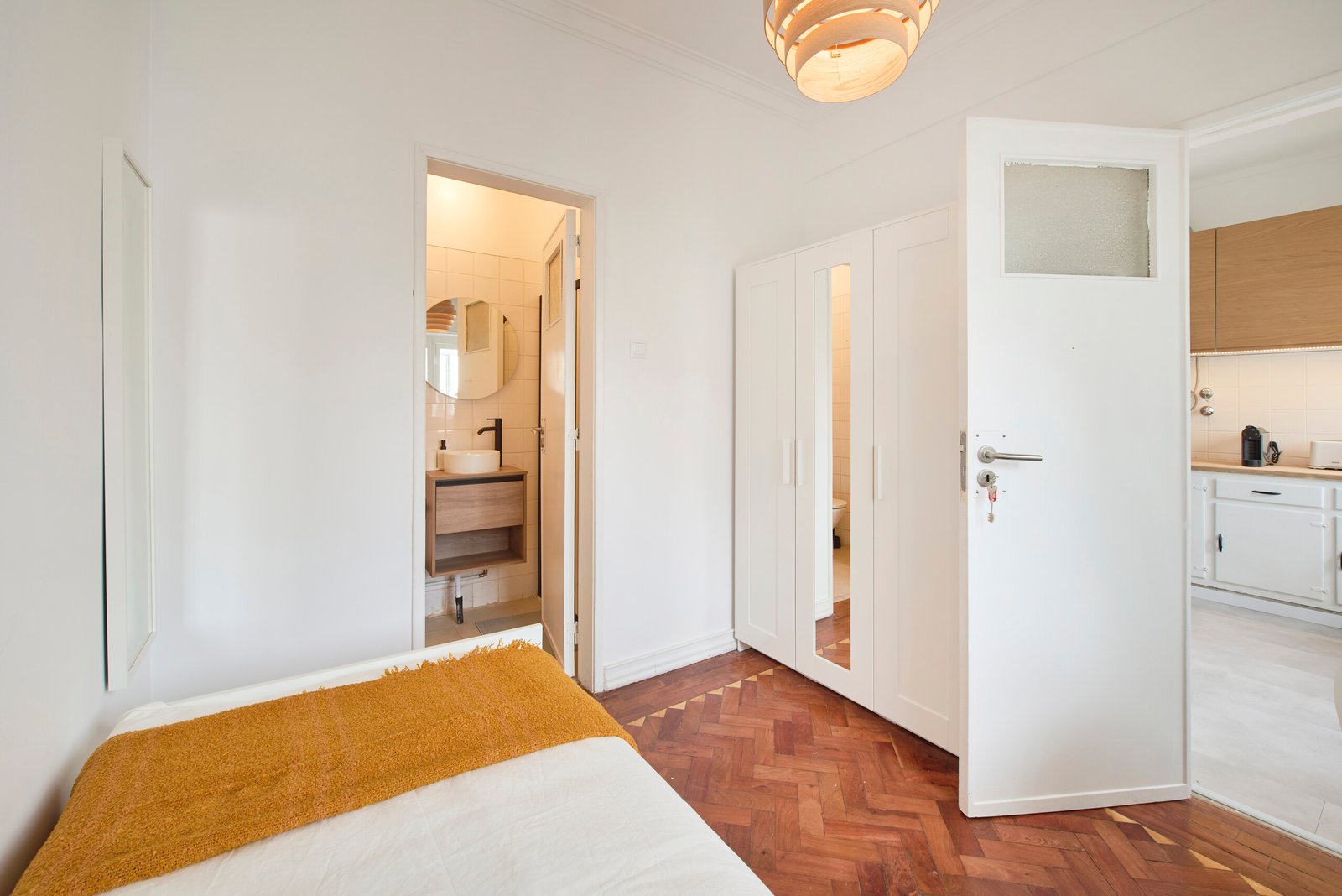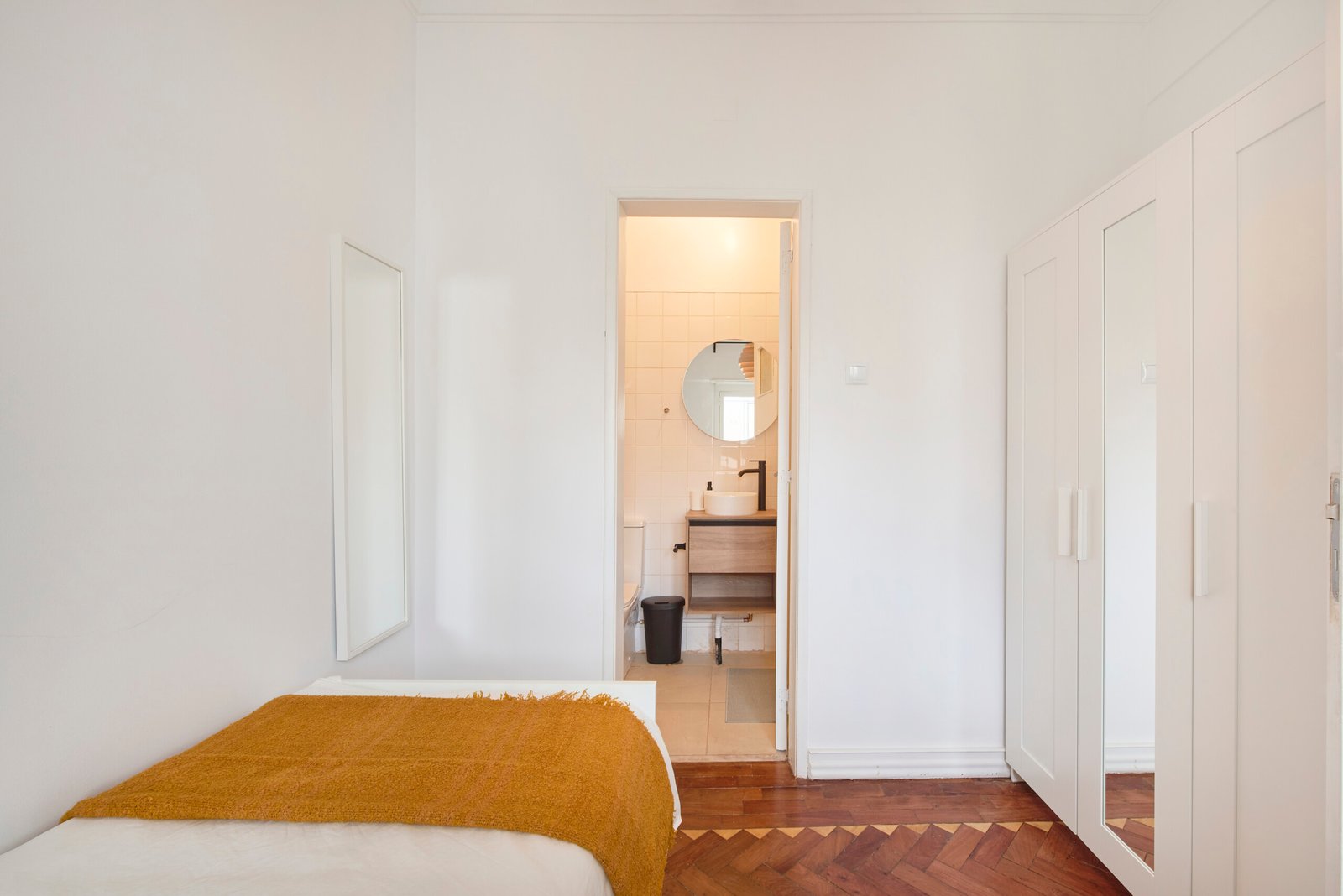 Beautiful ensuite with single bed, private bathrom and balcony in Campo Pequeno. The flat is on the 2nd floor and has elevator. It`s an 8- room apartment with 2 full bathrooms and an extra bathroom that belongs to an ensuite. It is located 1min walking to Campo Pequeno metro station (yellow line). The bills (water, electricity, gas and wifi) are included in the price as well as weekly cleaning of all common areas twice a week.